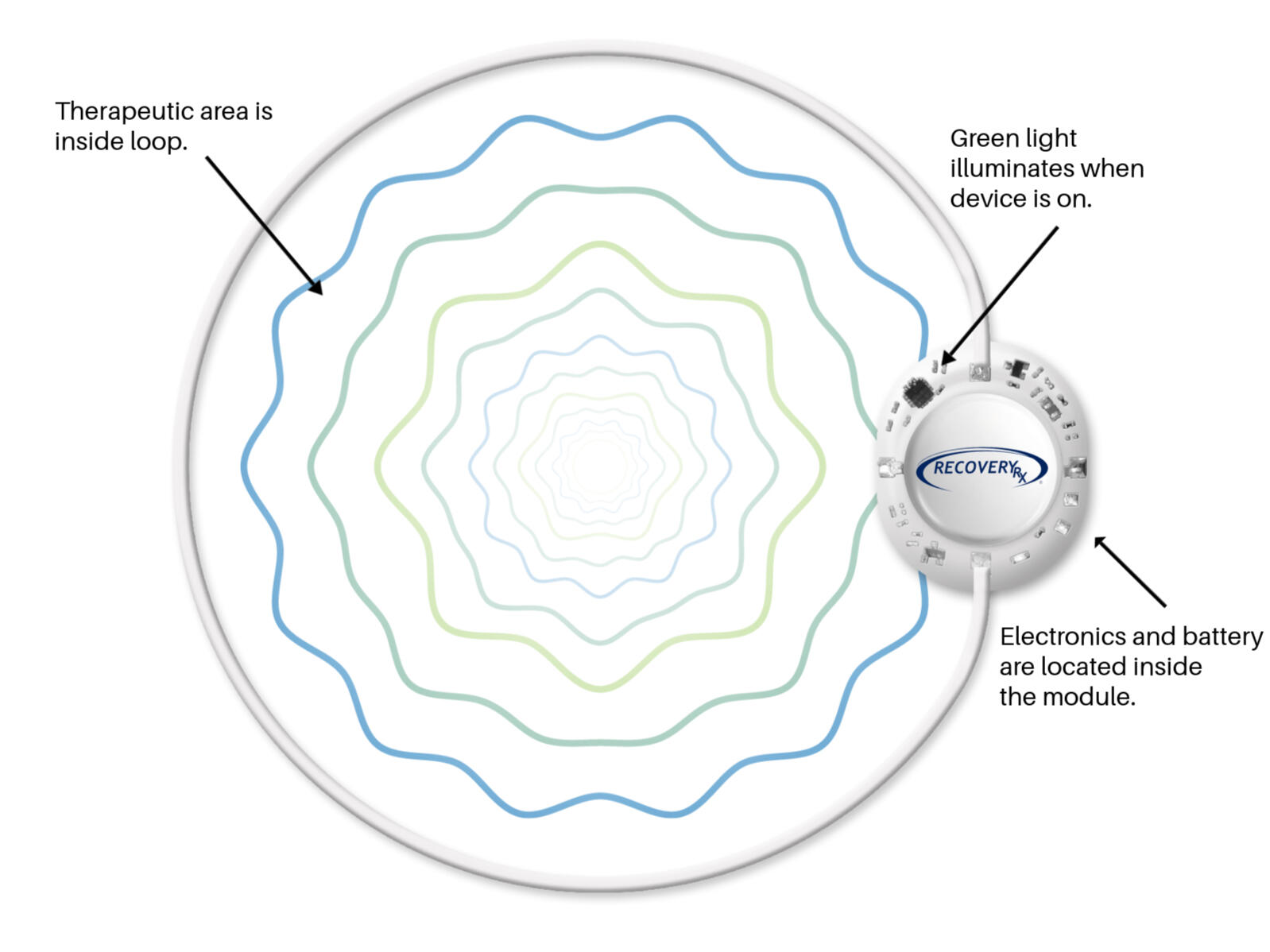 An innovation in drug-free pain and edema management. RecoveryRx is a class II, USA FDA-cleared, non-thermal shortwave therapy device which utilizes radio-frequency electromagnetic energy to modulate nerve activity. When used adjunctively, RecoveryRx has been found to reduce pain and the consumption of pain medication, including opioids. RecoveryRx is non-invasive and has no known side effects. Each unit delivers 720 hours of paresthesia-free therapy, allowing for 24/7 use.